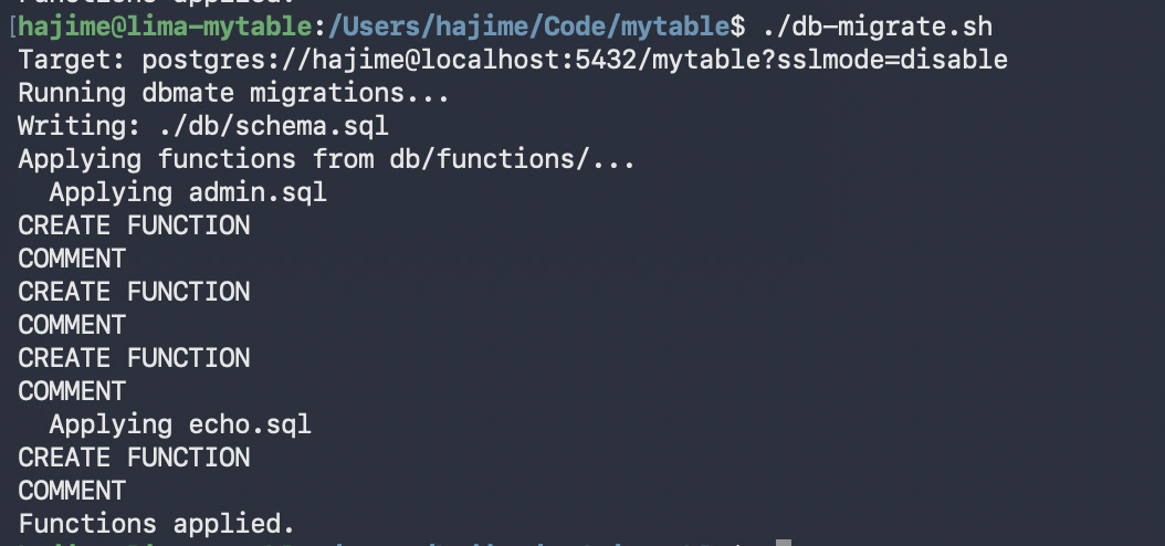 I’ve set up a development environment within a Lima VM. This is a standard practice I employ with all clients as it allows me to separate out the different dependencies, system packages, and other things the projects may need. However, with DCA (database-centric architecture) and vanilla frontend, I think this setup may be a bit too heavy-handed. I could see myself just using Docker Compose or something along those lines.